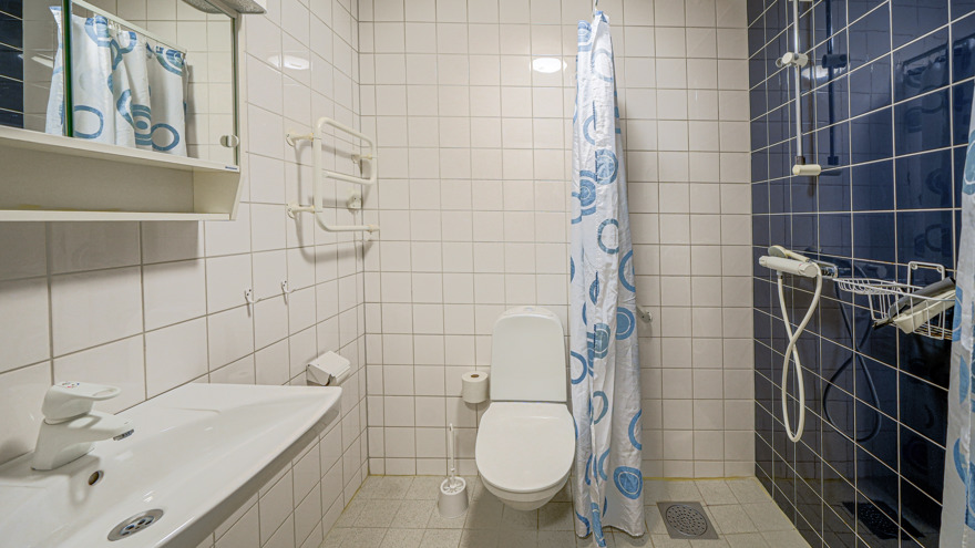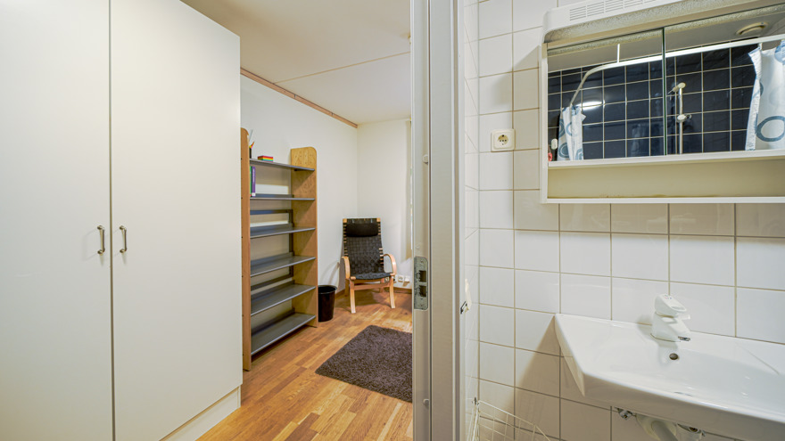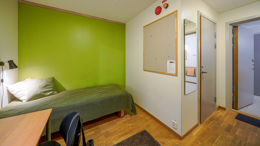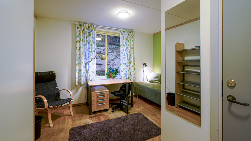 Rummen är utrustade med säng, skrivbord, stol, garderob, gardiner och matta. Alla rum har egen toalett och dusch. Man behöver ha med sig egna täcken och kuddar samt sängkläder.